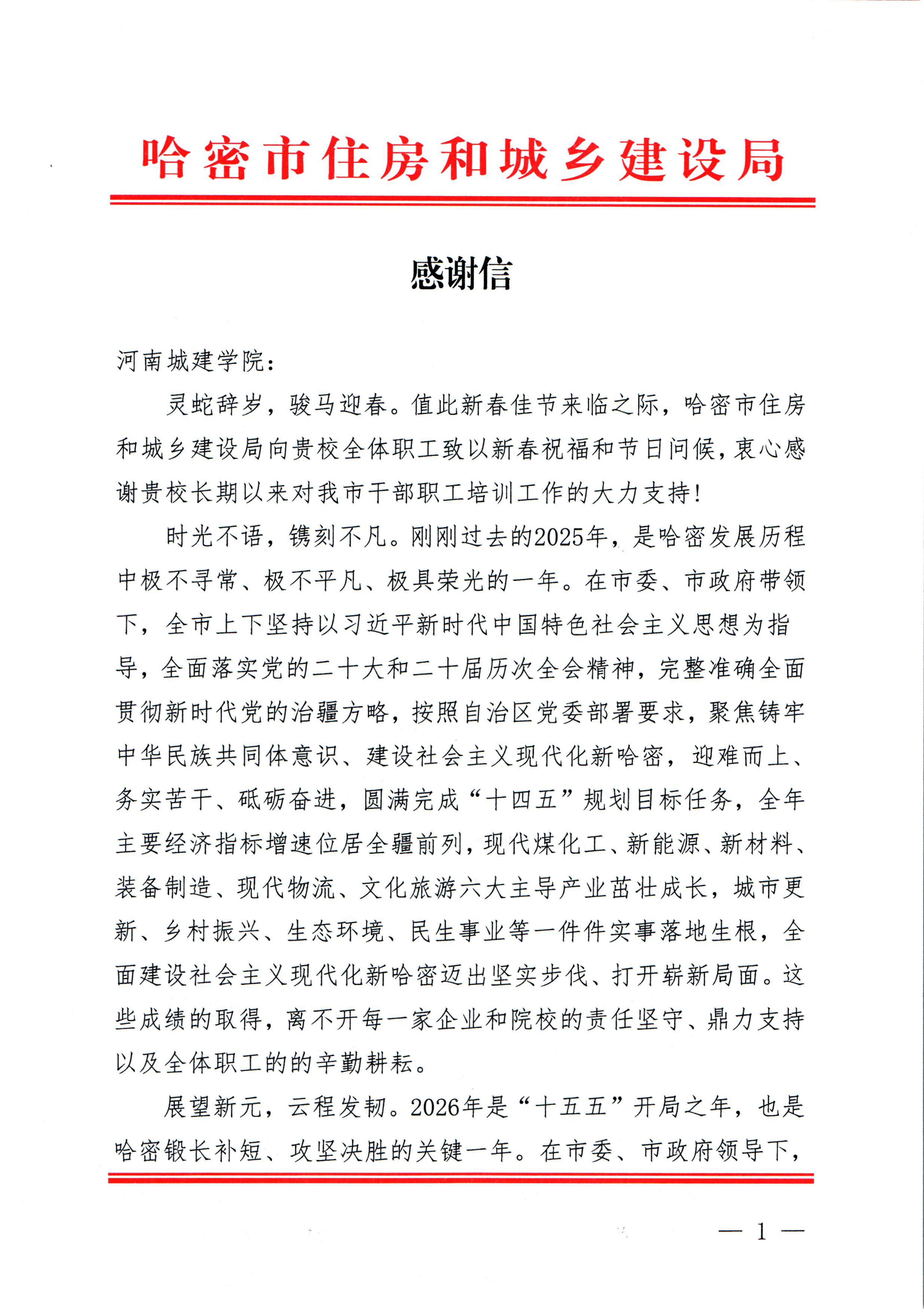近期,哈密市住房和城乡建设局向我校发来感谢信,对我校长期以来在哈密市干部职工培训工作中的大力支持与倾情助力致以诚挚谢意,并向全校教职工送上新春的美好祝福。